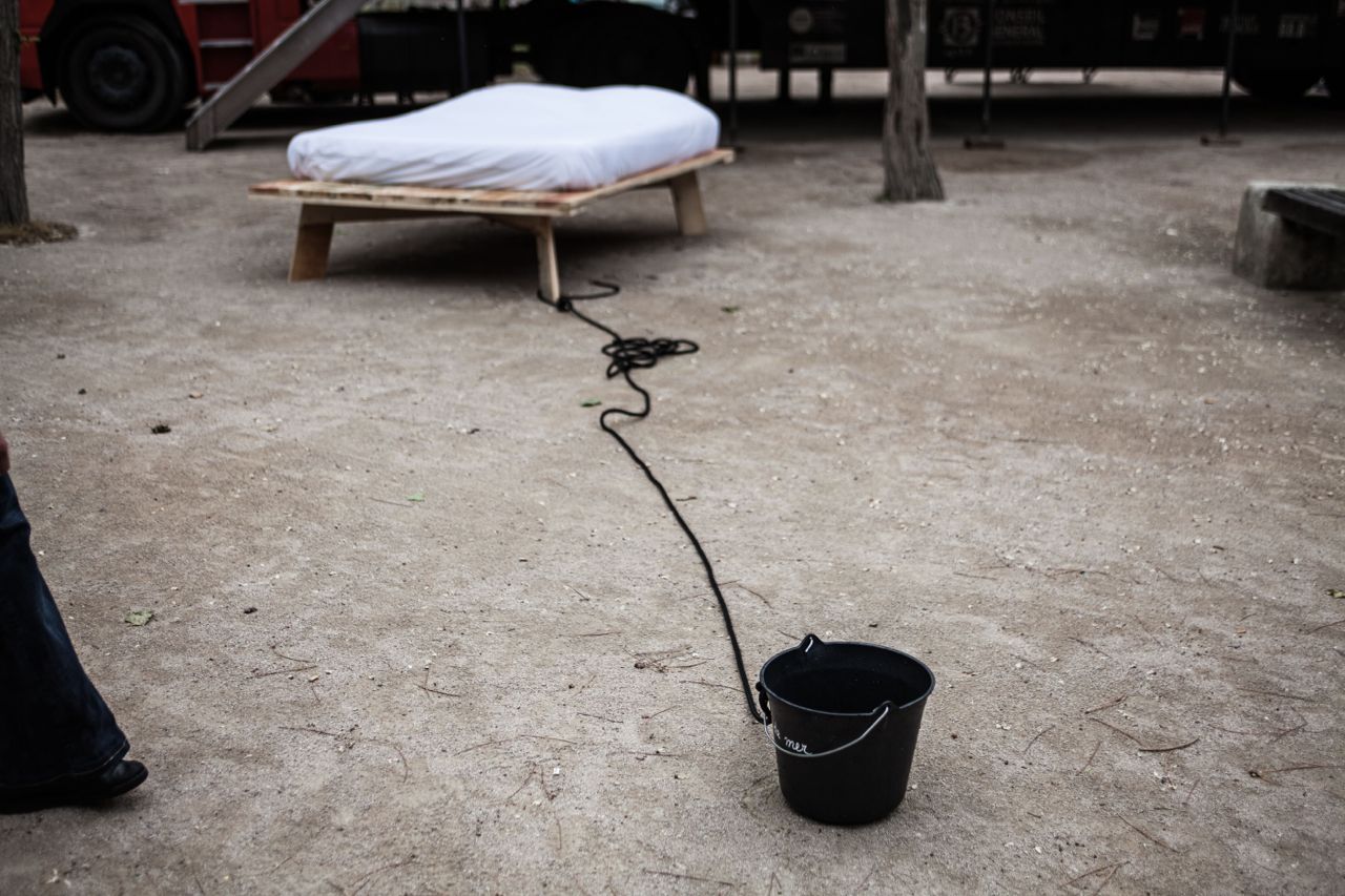 Footnote: During the 24 hours, situations were evolving and the performers were constantly present to suggest alternative but conceptual utilities of the bed as an invitation platform (horizontality, unconciousness, hospitality, mental departure, role of guest/host and traveler, resting, game)